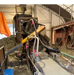 Clockwise: 3A Crosscut Heading; Washplant; Shaker Table; Recovered Placer Gold (more pictures and videos available here: December '25 Video and Pictures Link)